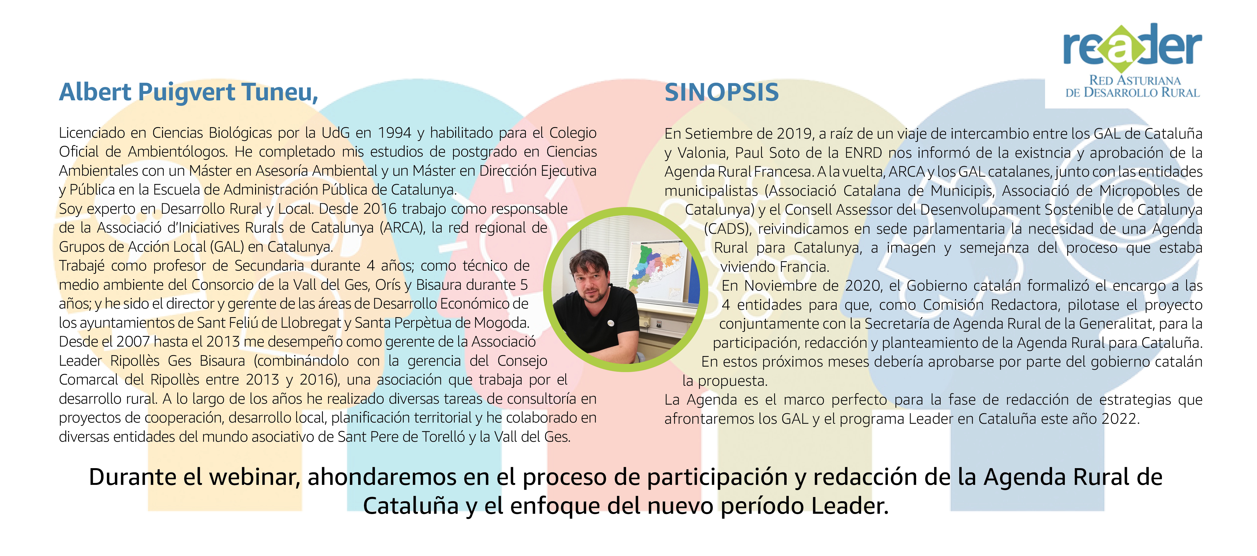 El gerente de la Associació d'Iniciatives Rurals de Catalunya (ARCA), Albert Puigvert Tuneu, nos acercará este lunes, 14 de marzo entre las 09.00 y 10.00 hora, a la agenda rural de Cataluña y a cómo se gestionan los fondos Leader en territorio catalán. El marco del encuentro digital es una serie de videoconferencias que se celebrarán los siguientes lunes de marzo y abril, organizado por la Red Asturiana de Desarrollo Rural (READER) para conocer cómo se están gestionando estas ayudas en otros territorios, tanto nacional como europeo.