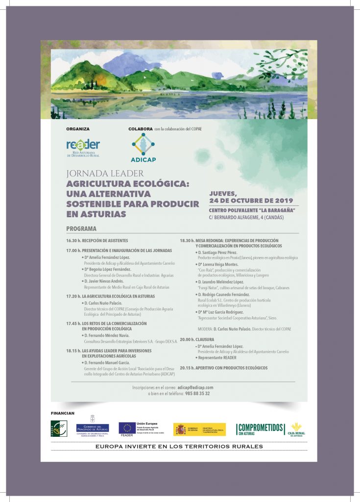 El Grupo de Desarrollo Rural (GDR) Asociación para el Desarrollo Integral del Centro Periurbano de Asturias (ADICAP) ha organizado para el jueves 24 de octubre la jornada 'Agricultura ecológica: Una alternativa sostenible para producir en Asturias'. El encuentro tendrá lugar en el Centro Polivalente de La Baragaña (Candás) a partir de las 16.30 con la recepción de asistentes, por lo que es necesario inscribirse.