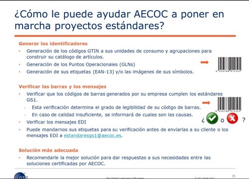 Un día después, martes día 18, se celebró el webinario “Primeros pasos para poner en marcha códigos de barras GS1 en productos frescos” impartido por la Asociación de Fabricantes y Distribuidores (AECOC); asociación que reúne a más de 30.000 empresas españolas de diferentes sectores de actividad como hostelería y restauración, textil, ferretería y bricolaje, salud, libros, etcétera. La misión de esta asociación es "mejorar la competitividad de toda la cadena de valor, compartiendo soluciones, estándares y conocimiento para hacerla más eficiente y sostenible, aportando mayor valor al consumidor". Además, AECOC es la representante en España de la organización global GS1, líder mundial en el desarrollo y la promoción de los principales estándares tecnológicos.
