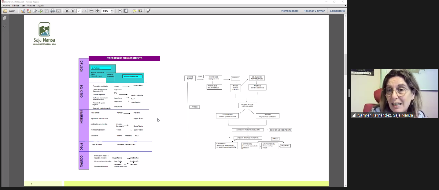 Elena Fernández, del Consorcio EDER, se centró en su exposición en lo que es más diferente en la Comunidad Foral de Navarra respecto a otras comunidades, como la aprobación de la convocatoria y las normas reguladoras, junto con un informe técnico de propuesta de convocatoria.