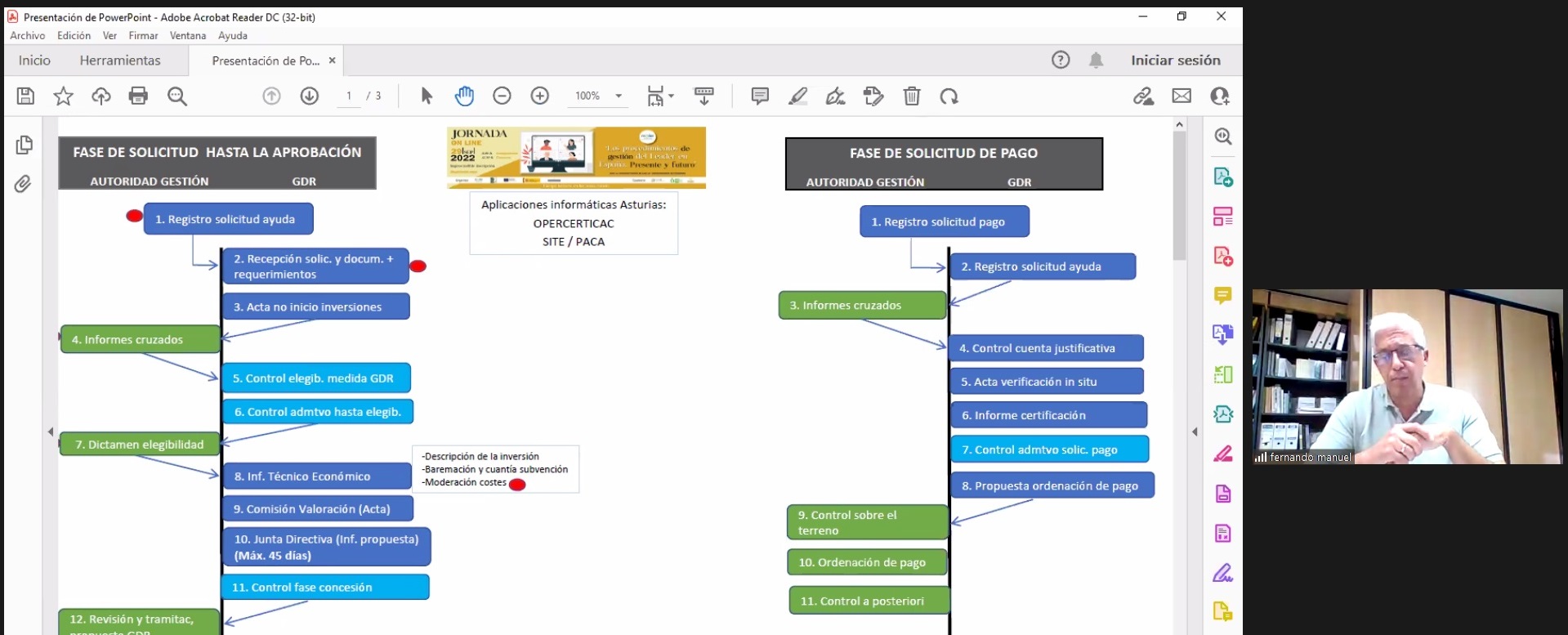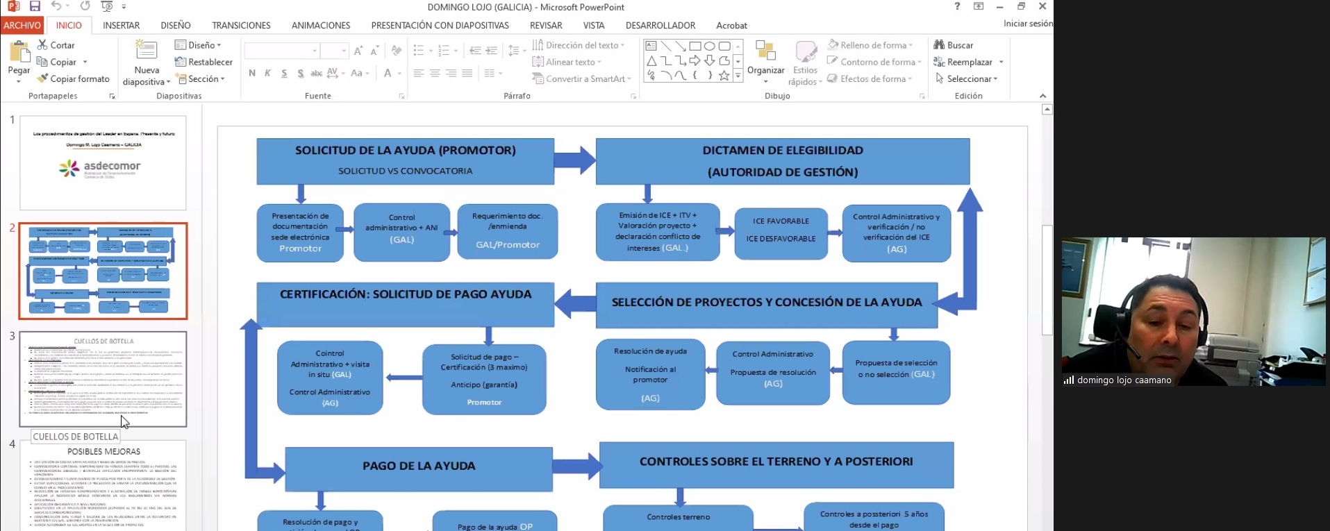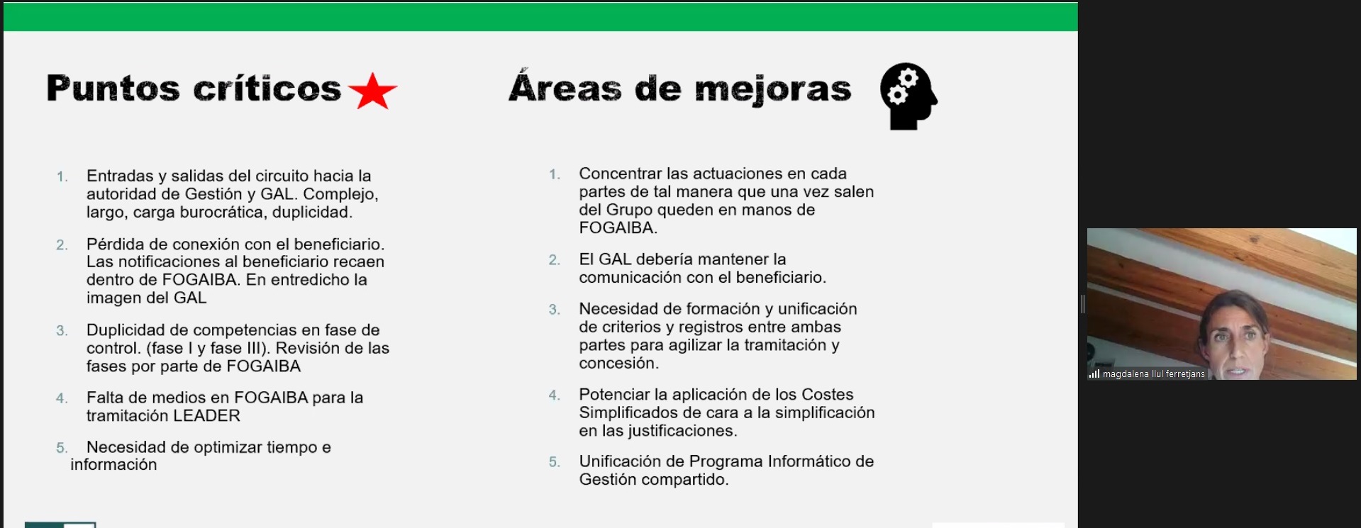 Tras describir el procedimiento de gestión, se centró en los puntos críticos, así como en el área de mejoras. En cuanto a la primera parte, señaló un proceso de entradas y salidas entre autoridad de gestión y GAL complejo, largo, con mucha carga burocrática y duplicidades; la pérdida de conexión con el beneficiario, donde es la autoridad la que notifica a aquel, con lo que entiende que se pone en entredicho la imagen del GAL; la duplicidad de competencias en la fase de control, así como la falta de medios en la autoridad de gestión para la tramitación Leader, junto con la necesidad de optimizar tiempo e información.