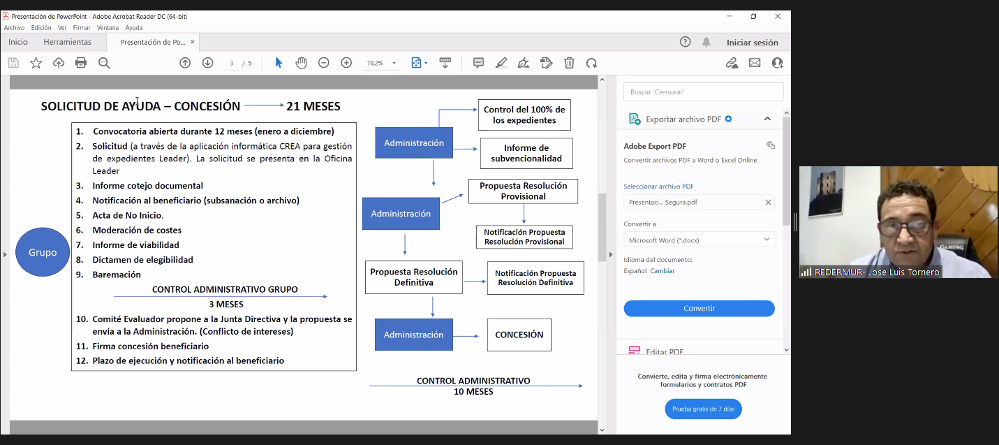 La exposición corrió a cargo de José Luis Tornero Carpena, del ADRI Vega del Segura, que, tras explicar el procedimiento de gestión, señaló como puntos críticos la excesiva burocracia y complejidad en la tramitación de expedientes que elimina la participación y corresponsabilidad privada; la sobrecarga en las tareas de la gestión de expedientes a pesar de la tramitación electrónica, habiendo cada día más papel; una reglamentación muy encorsetada y procedimientos diferentes en cada comunidad autónoma, lo que dificulta la cooperación entre GAL; el vacío jurídico en la tramitación de expedientes y actuaciones propias de los GAL; la pérdida en las competencias de los GAL, con reducción de funciones, que son meramente administrativas, ya que proponen pero no conceden; y los diferentes criterios de los órganos de decisión en la interpretación de los expedientes.