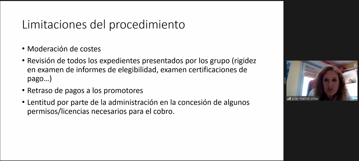 Puntos críticos: la aplicación informática es muy buena pero no devuelve absolutamente nada, ni avisos, ni clasifica expedientes por temas ni cualquier otro criterio. A ello sumó la moderación de costes y la rigidez del informe de subvencionalidad dado que el organismo intermediario no hace controles administrativos.