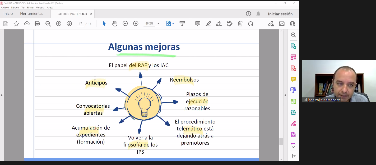 Para él las posibles soluciones son tres: la simplificación real de la parte administrativa, reformar la moderación de costes, podría ser muy interesante los costes simplificados también en la justificación ligada a módulos objetivos y, por último, las ayudas a tanto alzado aunque no las haya incluido en la presentación.