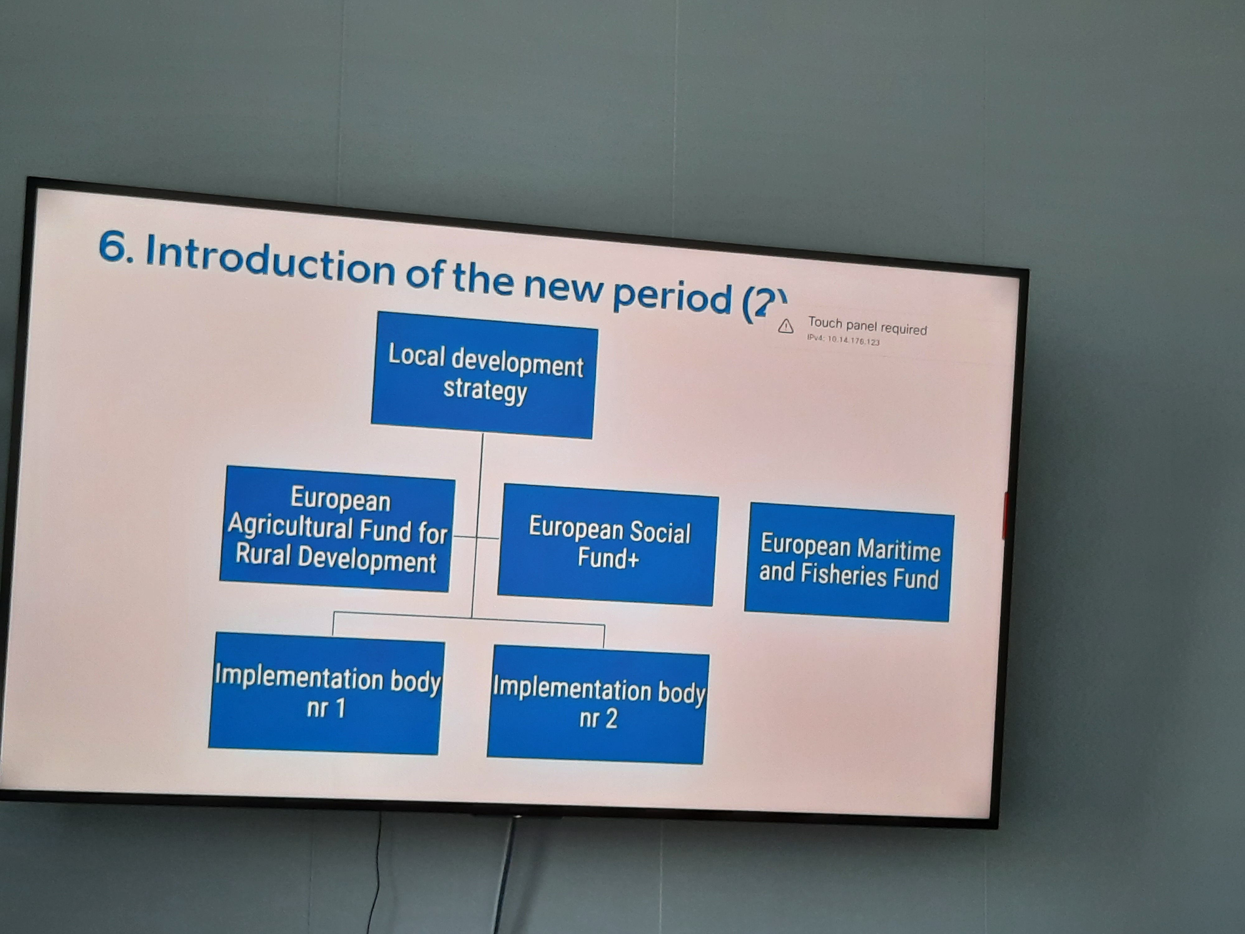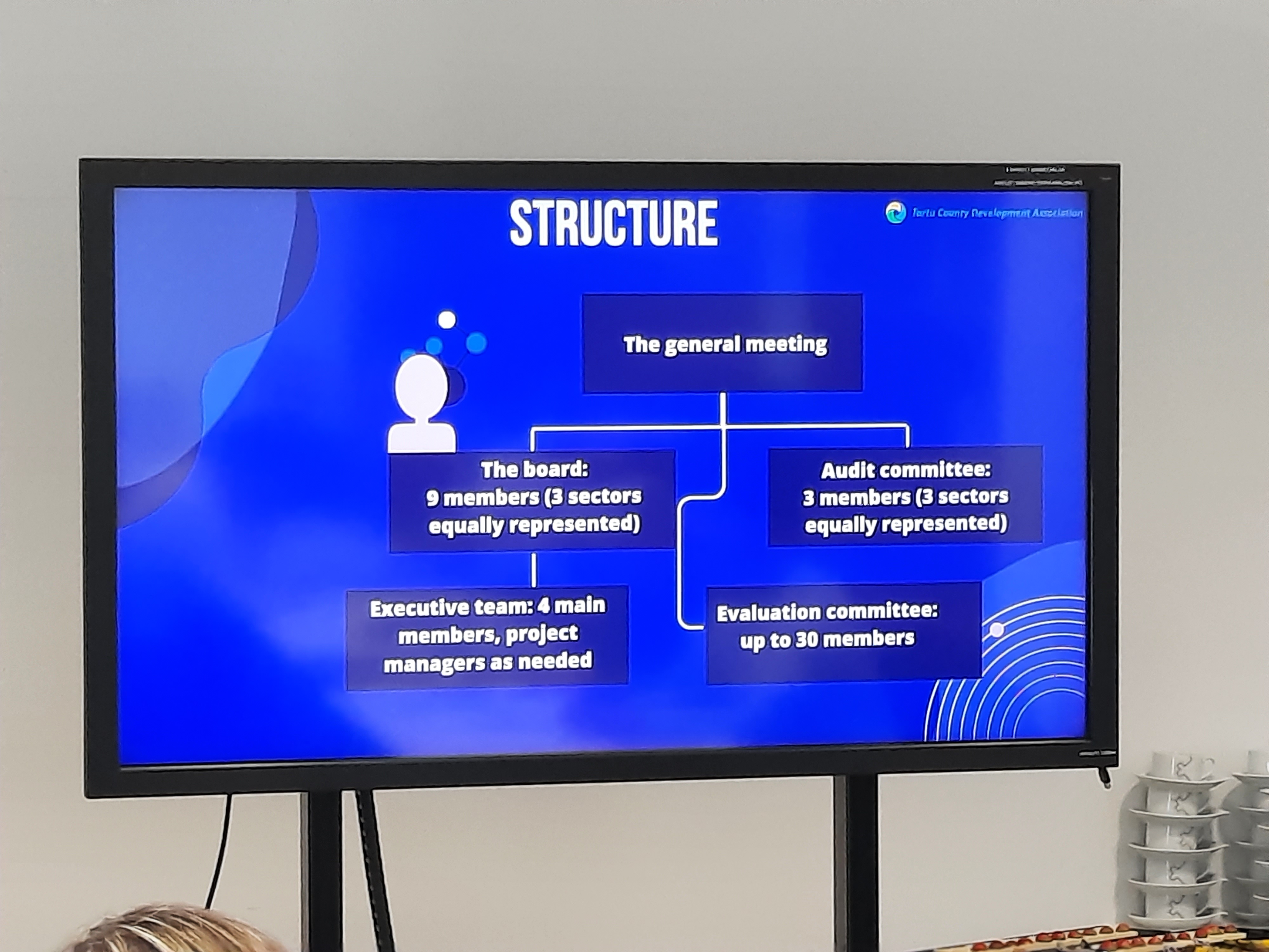 Kristiina Tammets explicó que la estructura es la misma para toda Estonia, con una Asamblea; una dirección compuesta por nueve miembros de tres sectores diferentes (entidades locales, ONG…); un comité de auditoría; un equipo ejecutivo de cuatro miembros a tiempo completo; comité de evaluación para proyectos compuesto por más de 30 miembros.