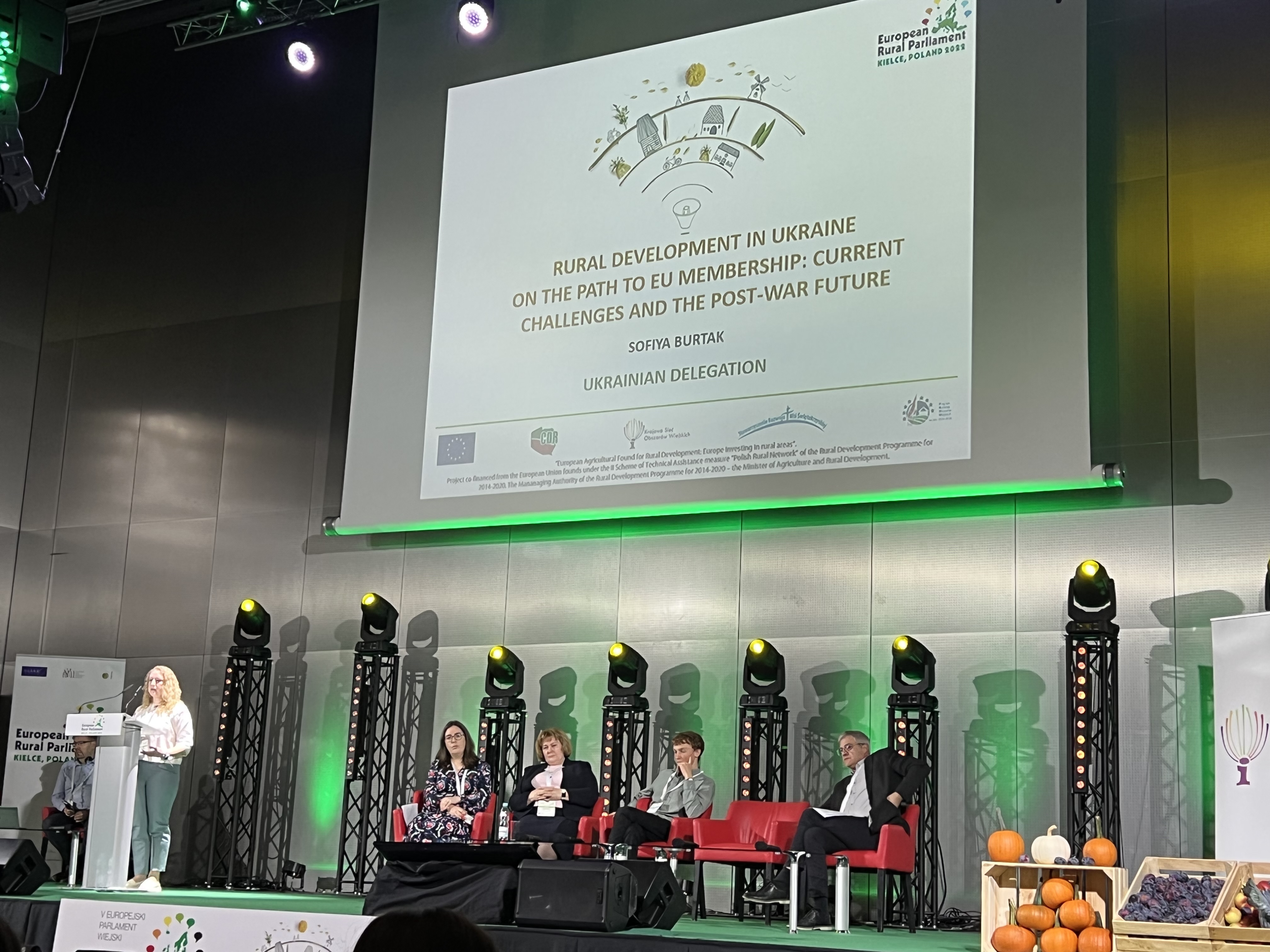 Sofiya Burtak, de la Red de Negocios de Mujeres Rurales de Ucrania, desarrolló un discurso que, como no podía ser de otra manera, relacionó con la guerra que se está viviendo en su país y cómo está afectando a su economía, su desarrollo y el papel que las mujeres están desempeñando con la movilización militar de los hombres. Estima que se han destruido unos tres millones de hectáreas productivas y que, tras ser bombardeadas, al cabo de unos días las vuelven a poner en producción. Habla también de los retos para la integración en la UE y el futuro en la posguerra, con un paisaje desolador por la destrucción de los misiles, además de los daños humanos. Hace hincapié en lo duro que es para las personas que trabajan en las granjas “el no estar conectadas con la tierra”, con muchos granjeros movilizados.