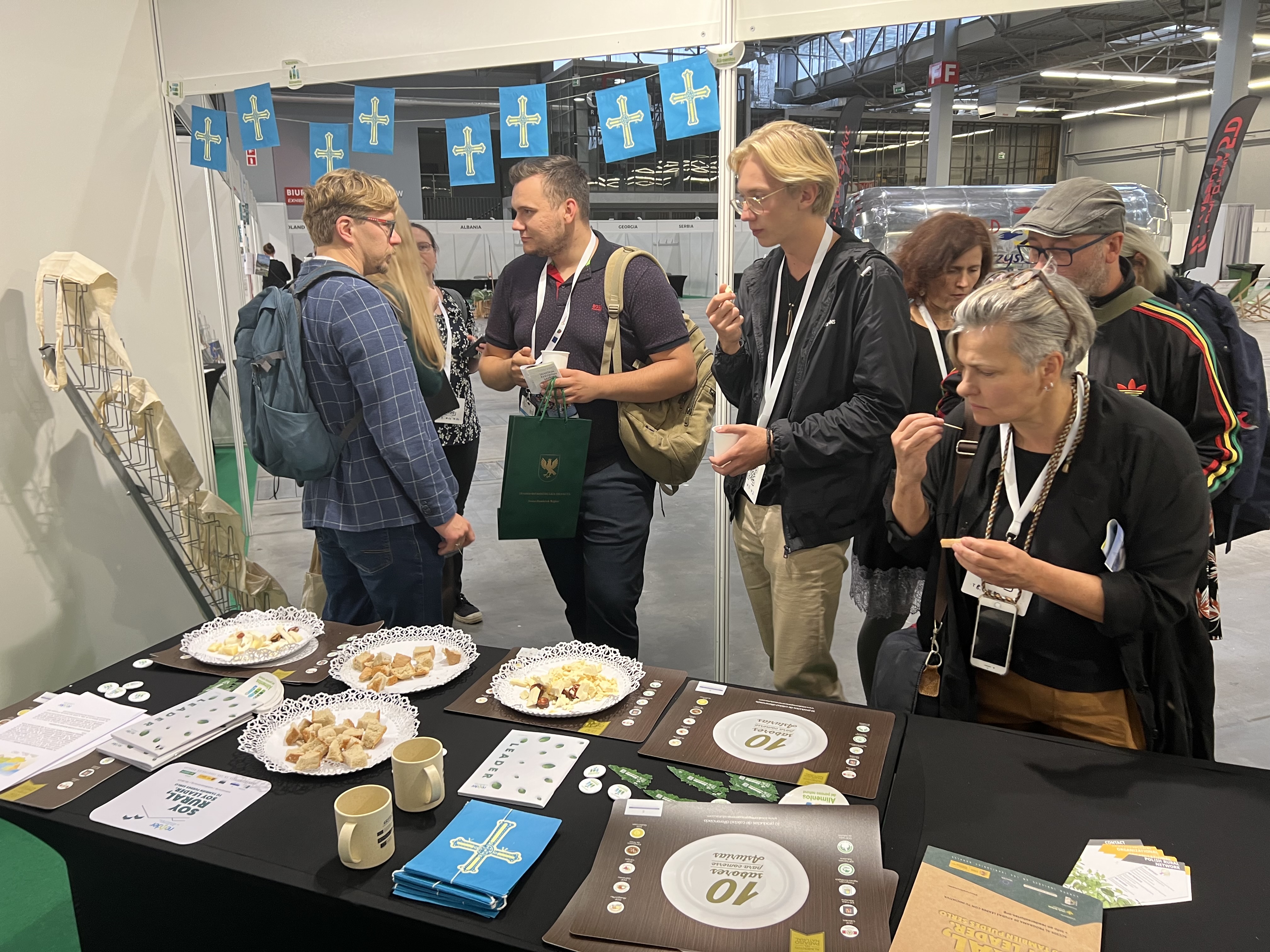 Completaron esta parte la colocación de estands por parte de las entidades asistentes, donde se daban a conocer productos artesanos de cada uno de los países y regiones, así como iniciativas de desarrollo rural. El exhibido por la Red Asturiana de Desarrollo Rural fue sin duda el más visitado, como por la delegación escocesa y su Gobierno, para probar los diferentes quesos y chorizo, así como para felicitar por la anterior edición y conocer el trabajo que se está llevando a cabo tanto desde READER como de sus grupos de desarrollo. Contamos para ello con la colaboración de la Consejería de Medio Rural y Cohesión Territorial y la marca de calidad Alimentos del Paraíso.