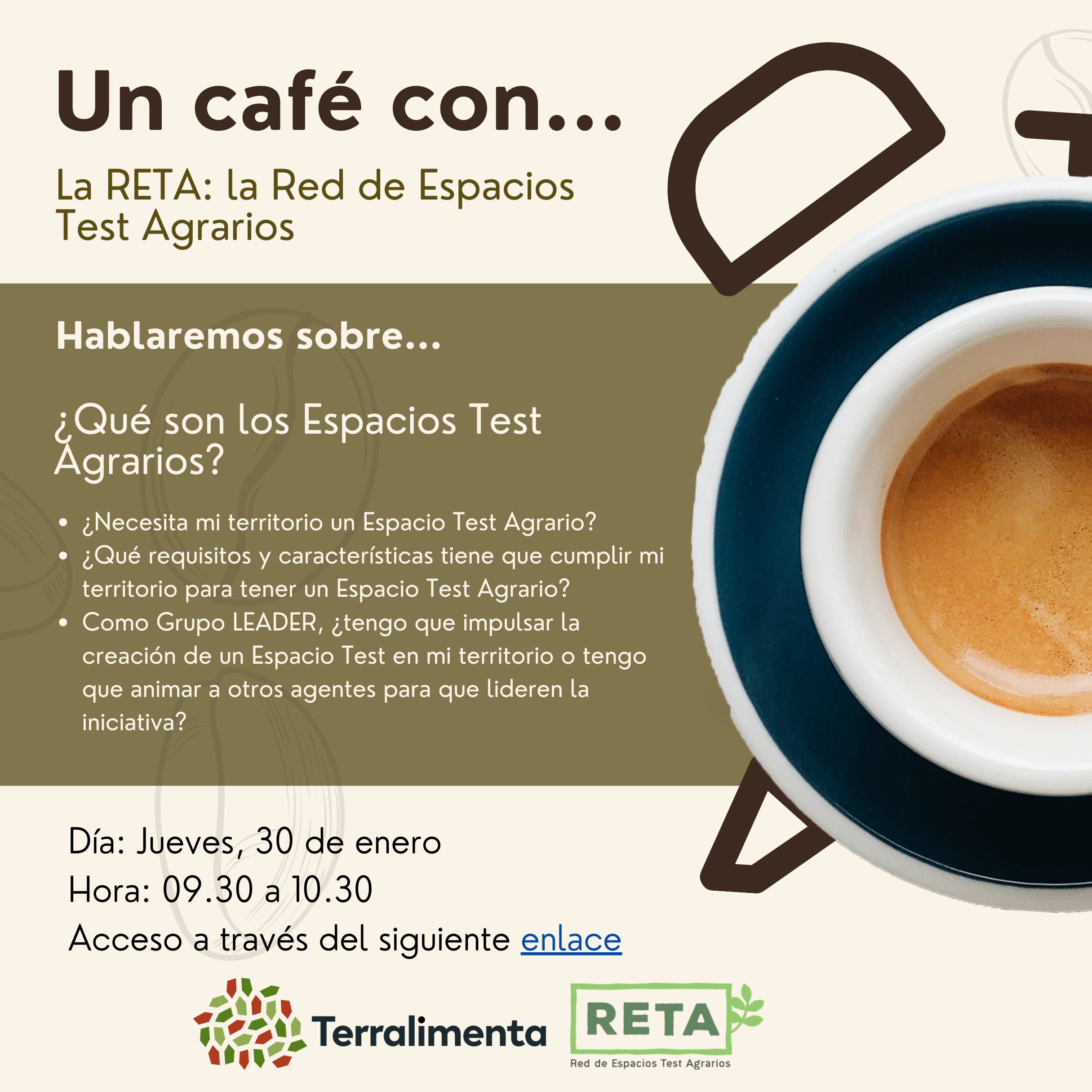 Os dejamos la invitación para asistir al segundo 'Un café con...', en esta ocasión con La RETA, la Red de Espacios Test Agrarios, que tendrá lugar el próximo jueves 30 de enero, entre las 09.30 y las 10.30. Está dirigido a todos los grupos LEADER y otros agentes del territorio que estén en interesados en poner en marcha esta iniciativa. Se puede acceder a través de este link y no se necesita inscripción previa.